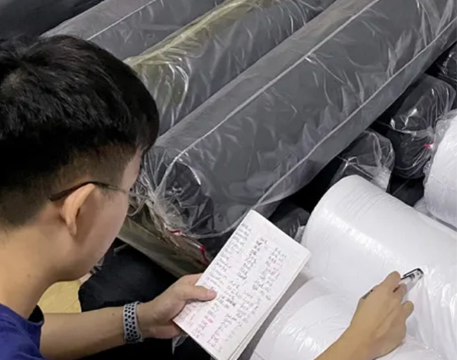 Check the fabric label and packaging to ensure it matches the purchase order; check the specifications and quality and pay attention to whether there are any problems such as damage, color difference, stains, etc.
